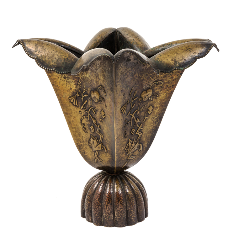 the floriform vase having a beaded edge above a body with stylized repousse floral and foliate decoration and an allover spot hammered surface, raised on a lobed base signed illegibly to the underside.