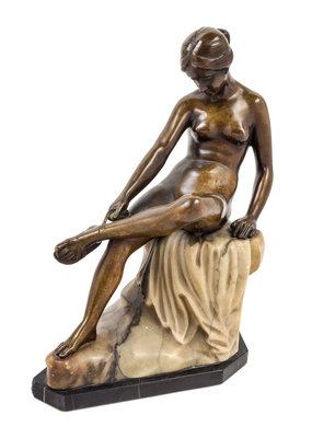 depicting a seated nude maiden tying her sandal.