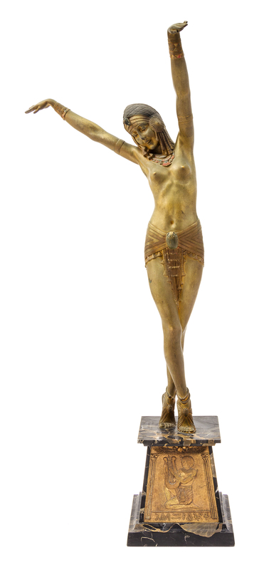 Egyptian Dancer, on trapezoidal marble base inset with a bronze plaque depicting an Egyptian lyre player, signed D.H. Chiparus in bronze.