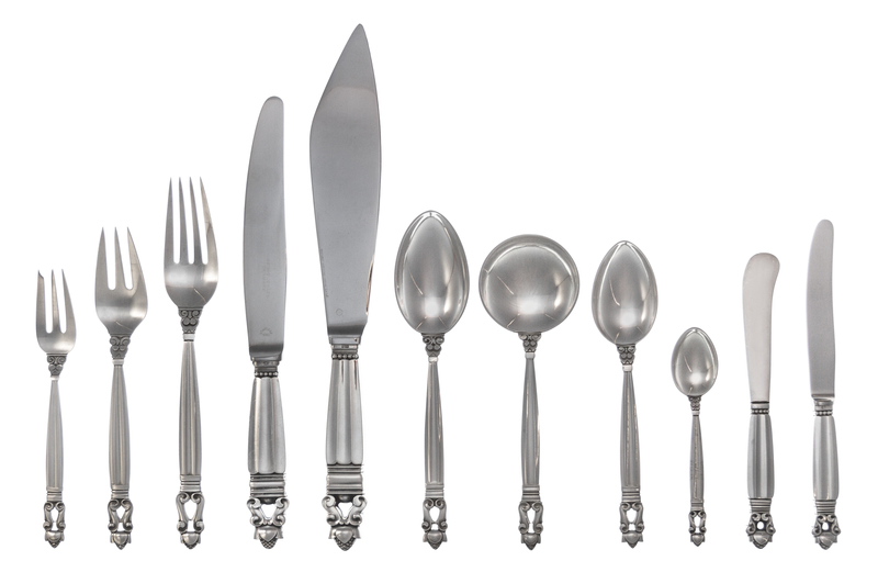 Acorn pattern, comprising:6 dinner knives6 butter spreaders12 fruit knives18 teaspoons12 soup spoons8 demitasse spoons6 dessert spoons6 dinner forks6 fish forks12 pastry forks1 salad serving set (2 items)1 cake knife1 vegetable serving spoon1 vegetable serving fork1 pierced serving spoon1 sugar spoon1 serving fork1 lemon fork1 sugar tongs1 cheese knife1 cheese plance1 nutcracker1 bottle opener1 pepper mill
