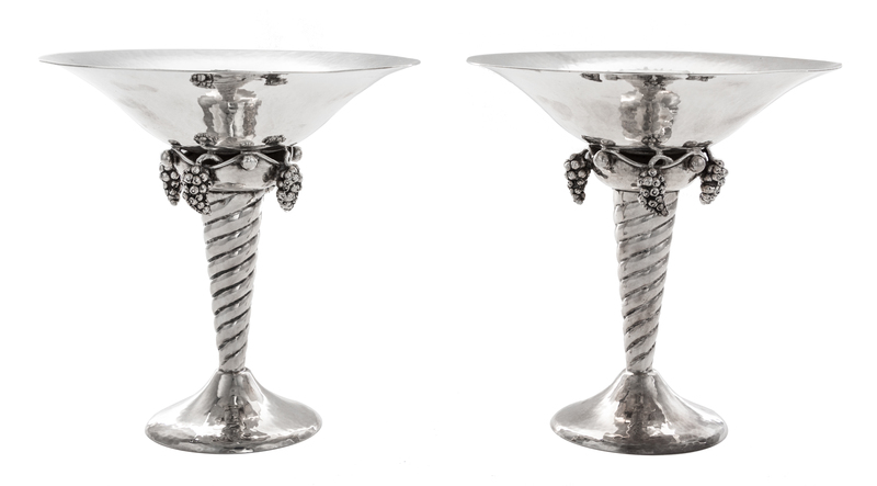 after the design by Georg Jensen, each having a flared bowl above pendant grape clusters and a twist stem, with a spot hammered finish and raised on a circular foot.