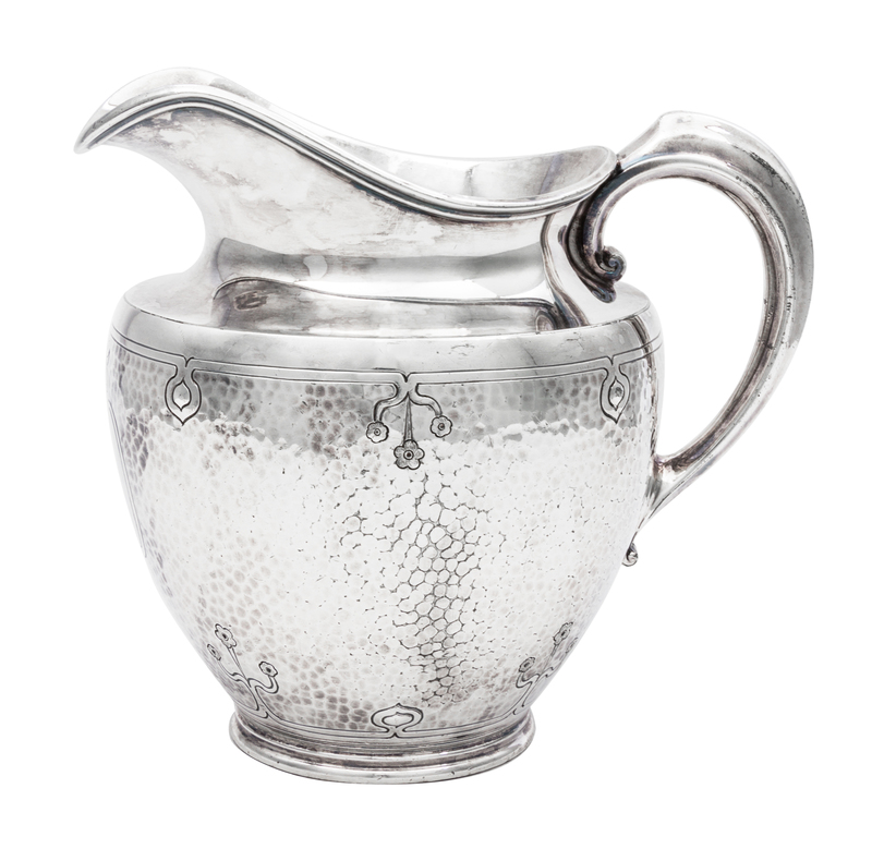 having a spot-hammered body decorated with incised geometric and floral designs and an applied rim to the mouth of the pitcher.