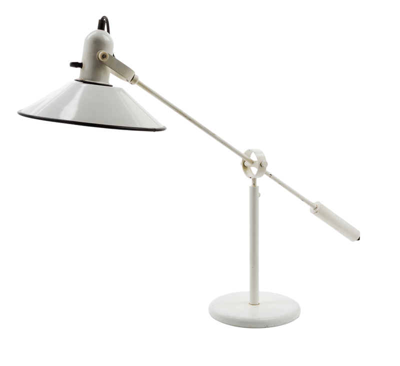 with a white enameled steel shade, stem, and circular base.