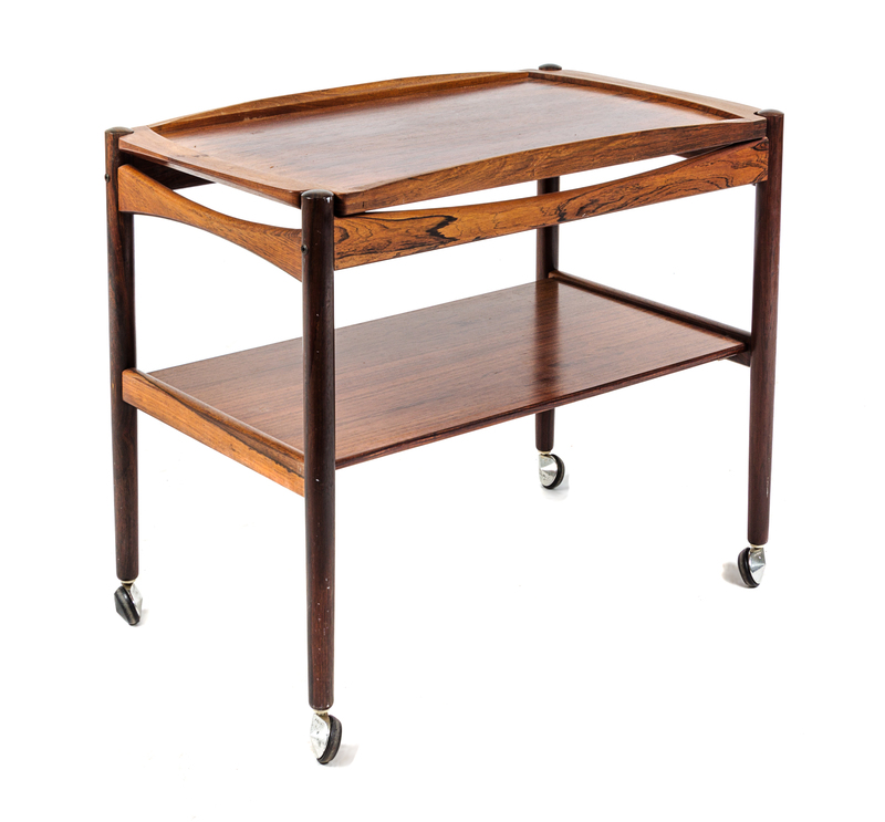 the shaped lift-off try top raised on cylindrical supports above a medial shelf ending in casters.