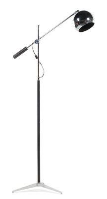 having a chrome spherical shade on a cantilevered arm, raised on an enameled metal standard ending in a tripod base.