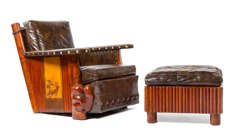 with leather upholstery and nail head decoration, each side of the chair decorated with a leaping stag.