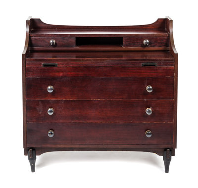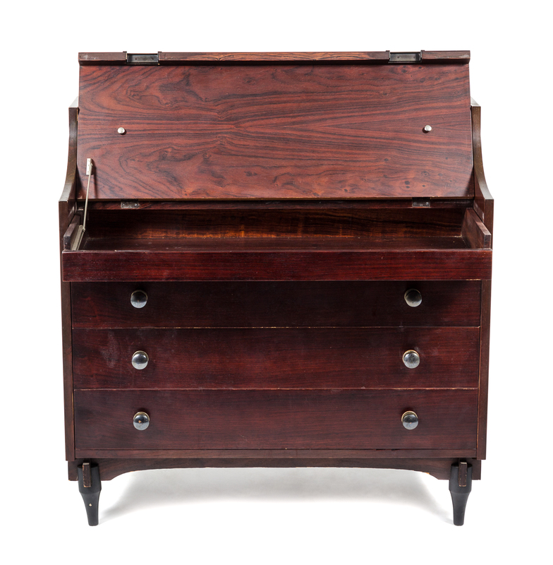 the hinged, pull-out top over three long drawers.