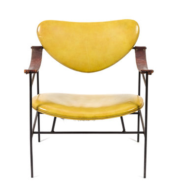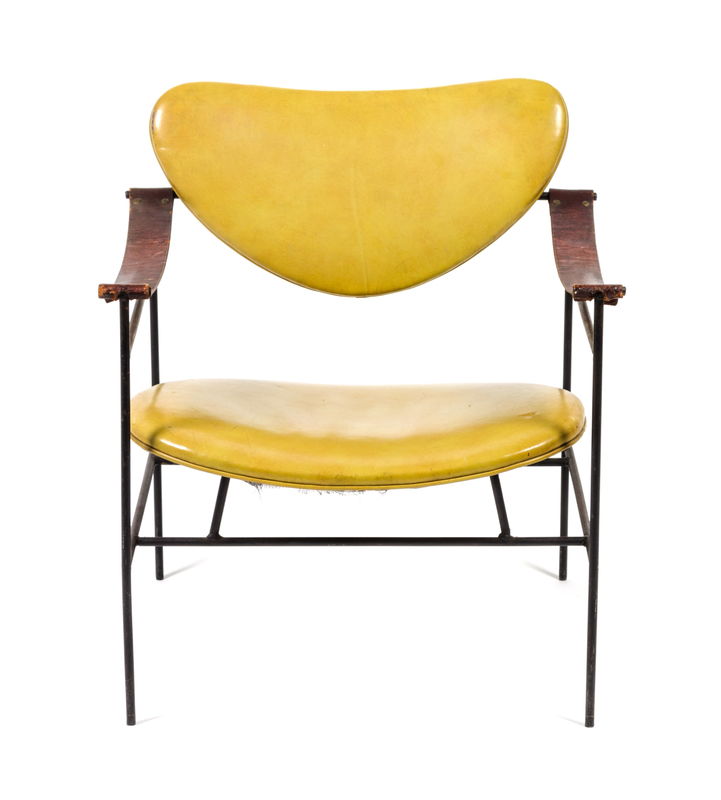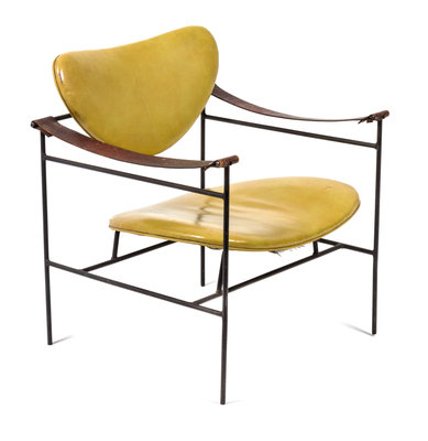 having a tubular wrought iron frame supporting an upholstered back and seat within leather strap armrests.