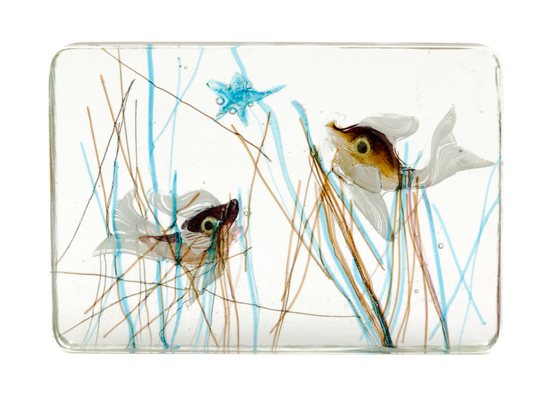 of rectangular form, depicting two fish amongst sea life.