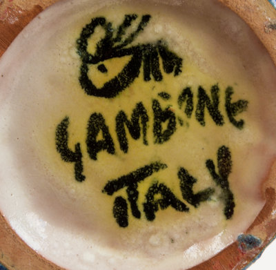 each of tapering form, worked to show horizontal bands of repeating decoration in blue and brown glazes, with Gambone Italy signature and donkey glyph to the underside.