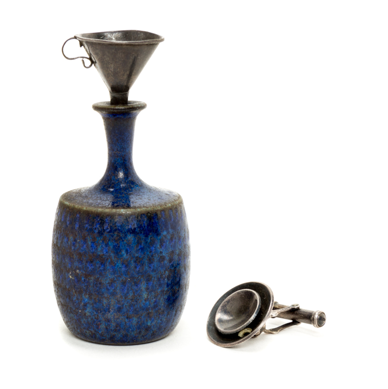 of bottle form with linear glaze, having a silver funnel and cap, signed indistinctly.