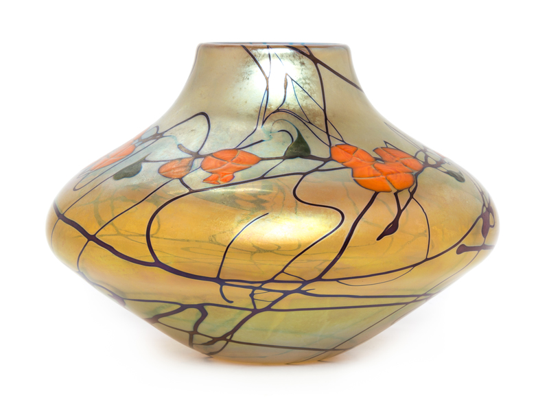 of low form in gold iridescence, with pulled linear decoration, with etched signature.