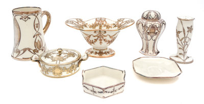 of various forms and overlay decorations, comprising a pitcher, a handled cup, a footed bowl, a tea caddy, a hat pin holder, a small covered handled bowl, a hexagonal handled bowl and a saucer, each with various printed marks; 8 total.