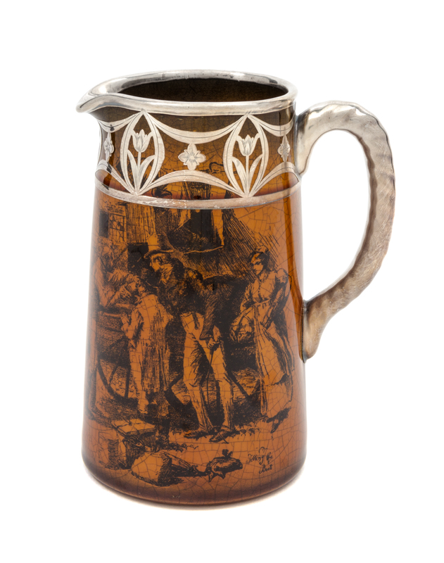 A Silver Overlay Transfer Decorated Ceramic Pitcher