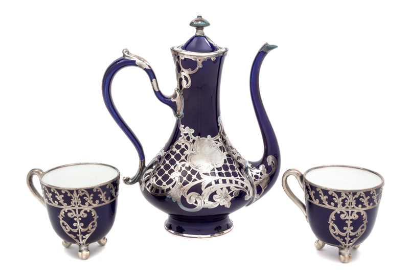 Three Porcelain Silver Overlay Tea Articles