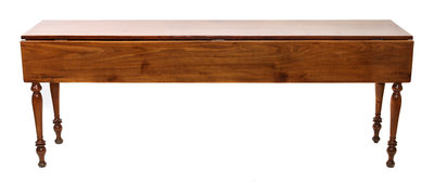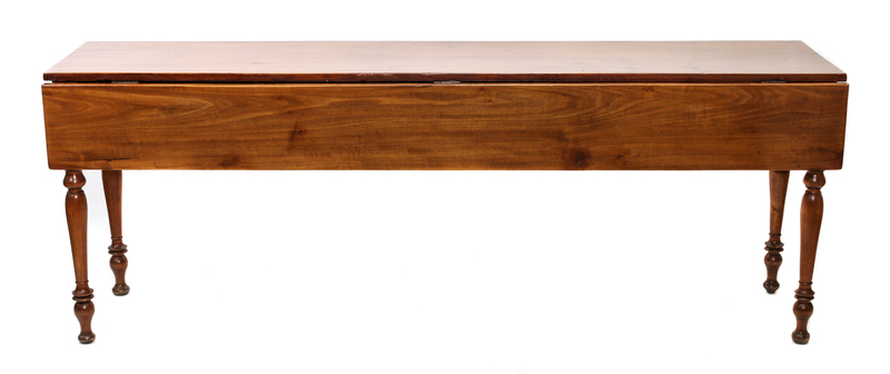 the rectangular top with conforming drop-leaves raised on turned legs ending in shaped feet.