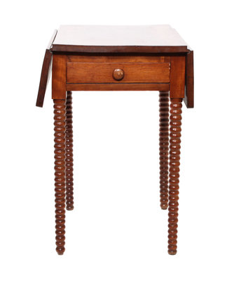 the rectangular top with conforming drop-leaves raised on turned legs.