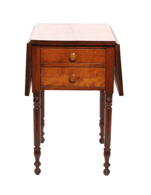 having a rectangular top with conforming drop-leaves, over two drawers, raised on ring-turned legs ending in knopped feet.