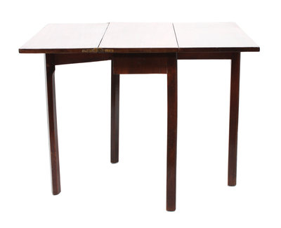 the rectangular top flanked by conforming drop-leaves to each side raised on square legs.