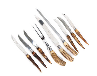 A Hasselbring Stainless Steel and Antler Carving Set and Steak Knives