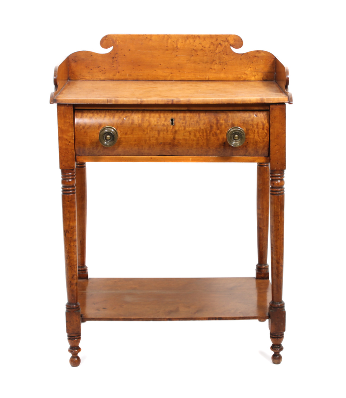 the three-quarter galleried rectangular top over a single drawer on turned supports joined by a medial shelf.