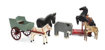 including a horse and carriage, a pull horse with saddle, a draft horse, a smaller pony and an elephant.