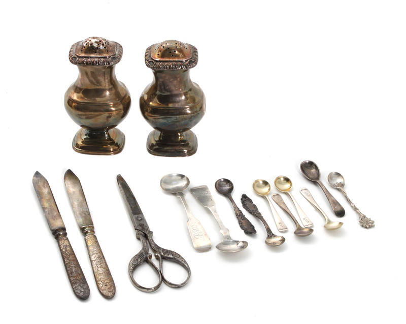 having repousse floral decoration; together with 10 other silver salt spoons, two silverplate salt and pepper shakers, a pair of Waterford crystal salts, two butter knives and a pair of scissors.