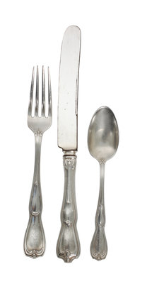 comprising:10 dinner knives10 luncheon knives17 dinner forks12 salad forks10 bouillon spoons21 teaspoons11 iced teaspoons3 serving spoons6 demitasse spoons7 oyster forks3 fish knives7 butter knives1 master butter knife1 sauce ladle1 berry spoon1 fish fork1 tomato server13 other serving articles of a various makers