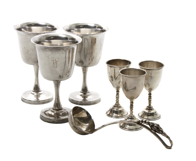 7 goblets together with 12 Mexican silver cordials and sauce ladle by a different makers.