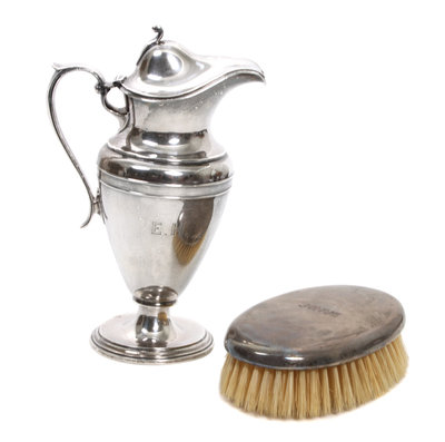 a Gorham monogramed milk pitcher and a Tiffany monogramed hair brush.