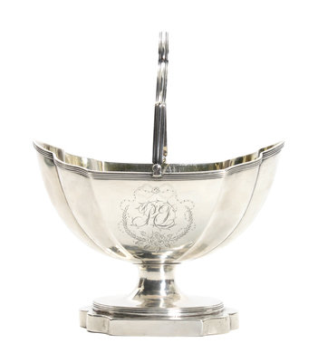 of lobed, footed form, surmounted by a swing handle, engraved with monogram PEL within a foliate and ribbon wreath.