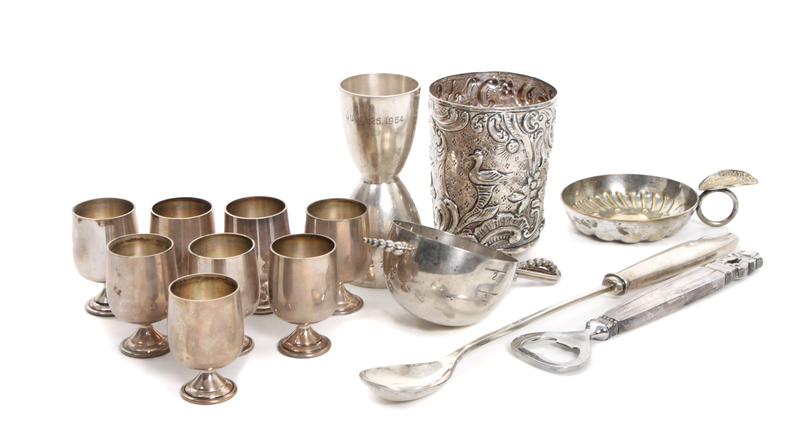 comprising eight cordials in presentation box, a Georg Jensen Acorn bottle opener, a double sided shot measure, an elongated stirring spoon, a brandy warmer and a repousse decorated cup, Samuel Boyce Landeck, Campden Square, London, circa 1895.