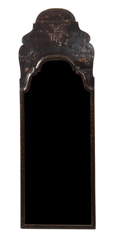 having a shaped crest over the rectangular plate, set within a conforming frame, decoration to show figures and floral motifs.