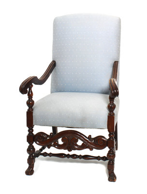 having high rectangular upholstered back and seat, carved scrolled out turned arms above turned legs and H-shaped stretchers with elebarately carved front stretcher.