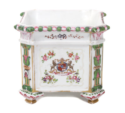 of cubic form with canted corners, depicting an armorial among floral blossoms.