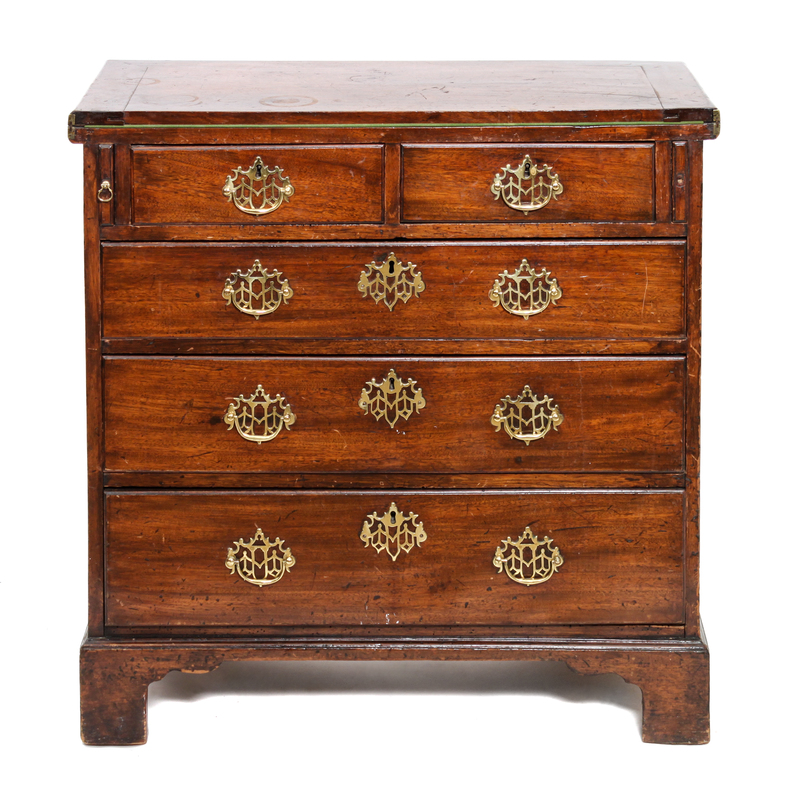 rectangular fold-over top opens to reveal felted surface over two short drawers and three long drawers on bracket feet.
