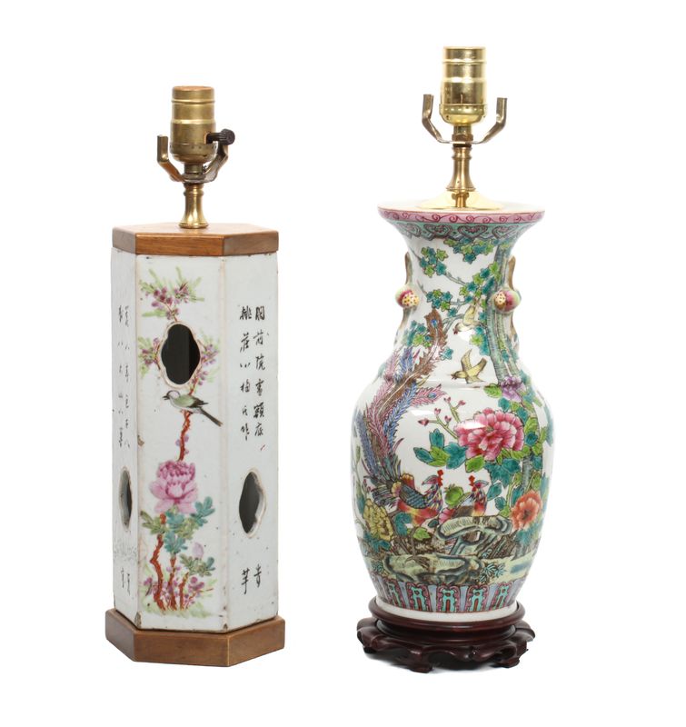 including a hexagonal hat stand and a vase, each fitted as table lamps.