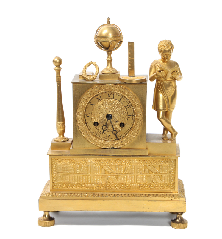 the circular dial with Roman numeral hours within a square case decorated to show a young boy reading and scholar's objects.