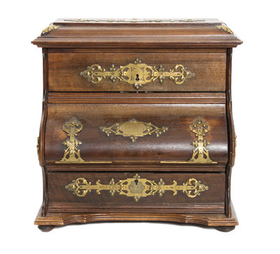of verticale design, top lifts to display fitted slats above small drawers with overall brass mount decoration.