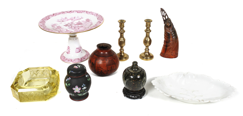 comprising a pair of brass candlesticks, a Wooster tazza, a blanc de chine leaf form dish, three vases, a Chinese carved horn and a molded amber glass ashtray.