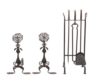 comprised of a pair of andirons and a three piece tool set on a stand.