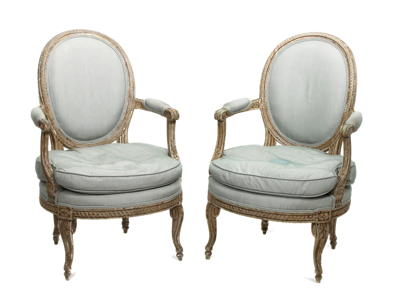 each having oval padded back flanked by channel molded arms above a shaped lift-off cushion seat, raised on cabriole legs.