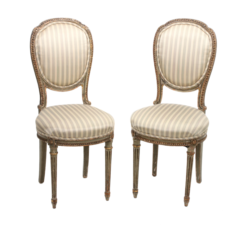 each having a lobed balloon back above a stuff-over cushion seat raised on fluted, cylindrical tapering legs.