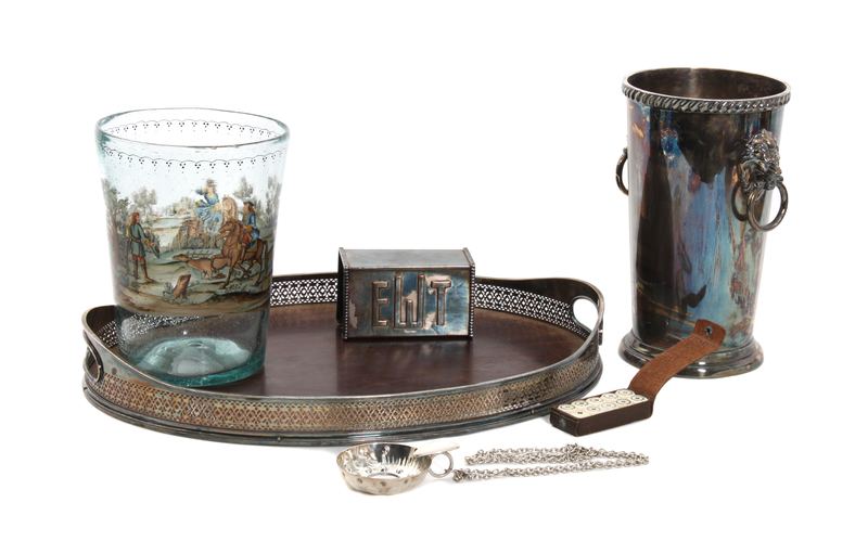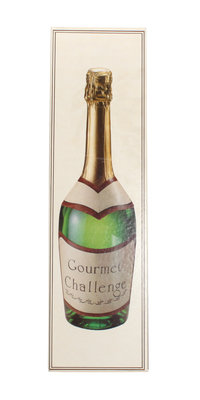 comprising a trivia game, "Gourmet Challenge", pertaining to fine food, wine and social etiquette, together with a decorative print, Cos D'Estournel, two wine coolers, a tray, a wine taster, Russian dice, a match holder, and a set of five serving articles. 13 items total.