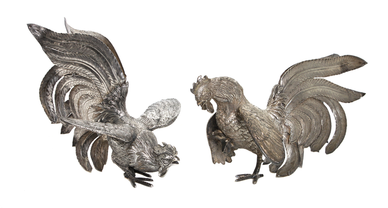 Two Peruvian Silver Fighting Roosters