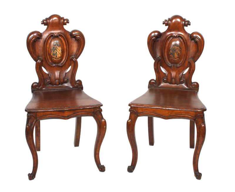 carved scroll decoration above solid back splat with painted center cartouche flanked by stylized shaped scrolls, trapezoidal shaped seat on elaborate cabriole legs.