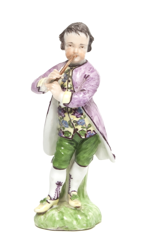 depicting a boy in 18th century attire playing a wood instrument, raised on a naturalistic base.