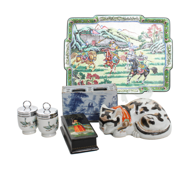 including a Delft style inkwell, a Russian box, two Royal Worcester egg coddlers and a Chinese enameled metalware tray.