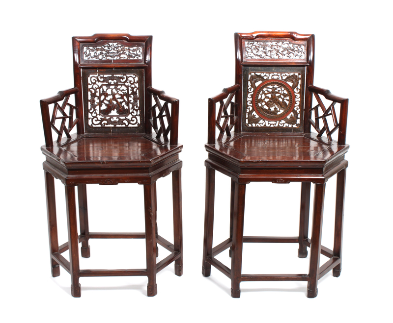 each having a stepped crest rail above a pierce carved splat and cracked-ice arm supports over an octagonal seat raised on square legs joined by stretchers.
