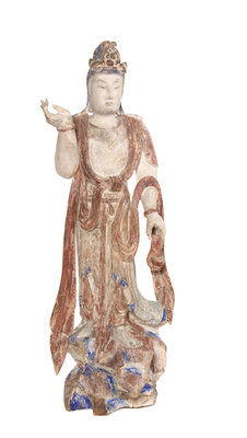 the figure depicted standing wearing a dhoti, her left hand stretched down holding an amphora vase with her right hand raised, wearing a peaked tiara.